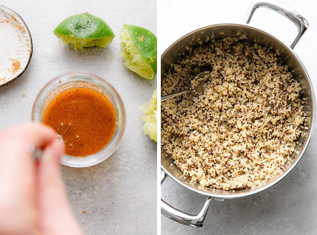 Quinoa dressing: In a small bowl or jar, whisk together the lime juice, olive oil, cumin, chili powder, and salt. Season to taste.
