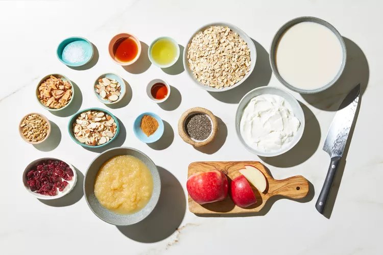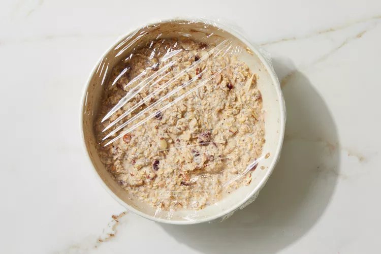 - Stir oats, almond milk, yogurt, applesauce, dried apples, cranberries, almonds, apple juice, sunflower seeds, chia seeds, maple syrup, vanilla, cinnamon and salt together in a large bowl. Cover tightly and refrigerate for at least 8 hours (and up to 3 days).